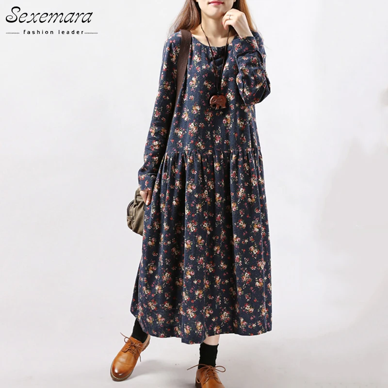 New Style Autumn Winter Women Dresses Vintage Print Casual Long Sleeve Cotton Linen Maxi Dress Swing Floral Big Size Dress