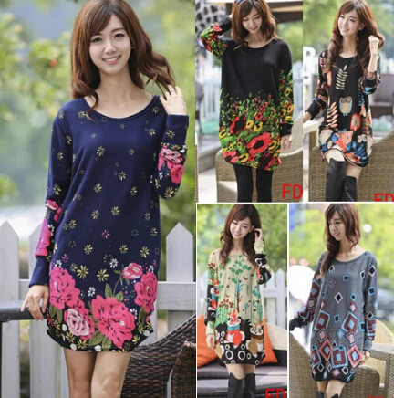 new 2016 Women's autumn spring plus size flower print long-sleeve pullover casual dress dresses tops 3XL big
